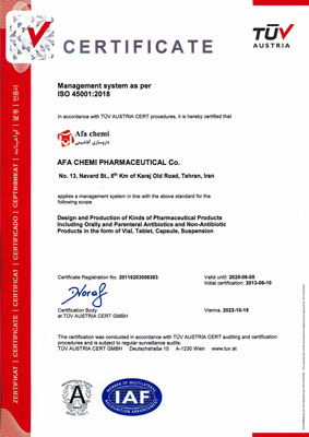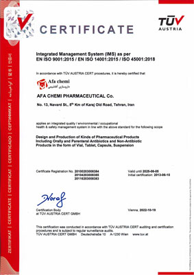 شرکت داروسازی آفاشیمی با تکیه بر نیروی انسانی متخصص و دانش فنی روز، در طراحی و تولید آنتیبیوتیکهای بتالاکتام (خوراکی و تزریقی) و ویالهای تزریقی عمومی، گامهای مؤثری در استقرار سیستم مدیریت یکپارچه برداشته است. ما با ارتقای کیفیت، توسعه فعالیتها و رعایت اصول حرفهای، حفظ کرامت مشتریان، ذینفعان و کارکنان را در اولویت قرار میدهیم و به حفاظت از محیطزیست و ارزشهای جامعه پایبندیم.