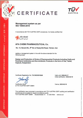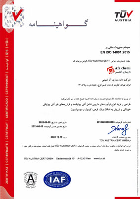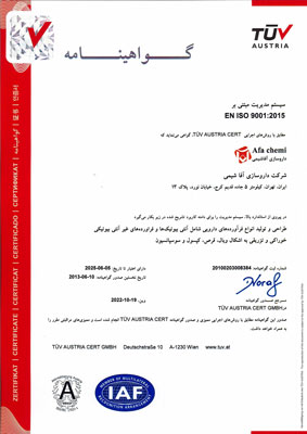 آفاشیمی با استقرار استانداردهای بینالمللی ISO 9001:2015، ISO 14001:2015، ISO 45001:2018، ISO 10015:1999 و ISO 10013:2001 و رعایت الزامات GMP، قوانین زیستمحیطی و ایمنی و بهداشت حرفهای، مسئولیت خود را در مسیر توسعه پایدار و تحقق چشمانداز سازمانی با جدیت دنبال میکند.